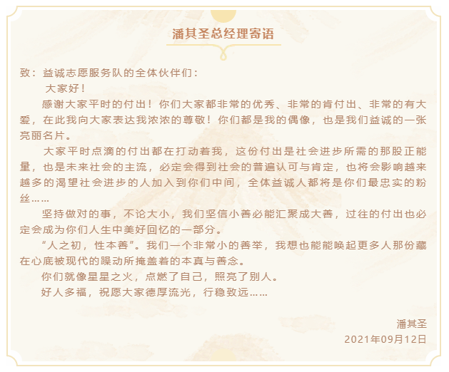 本次團建活動結束后,潘其圣總經理特寄語全體志愿者伙伴,勉勵大家德厚流光,行穩(wěn)致遠:
